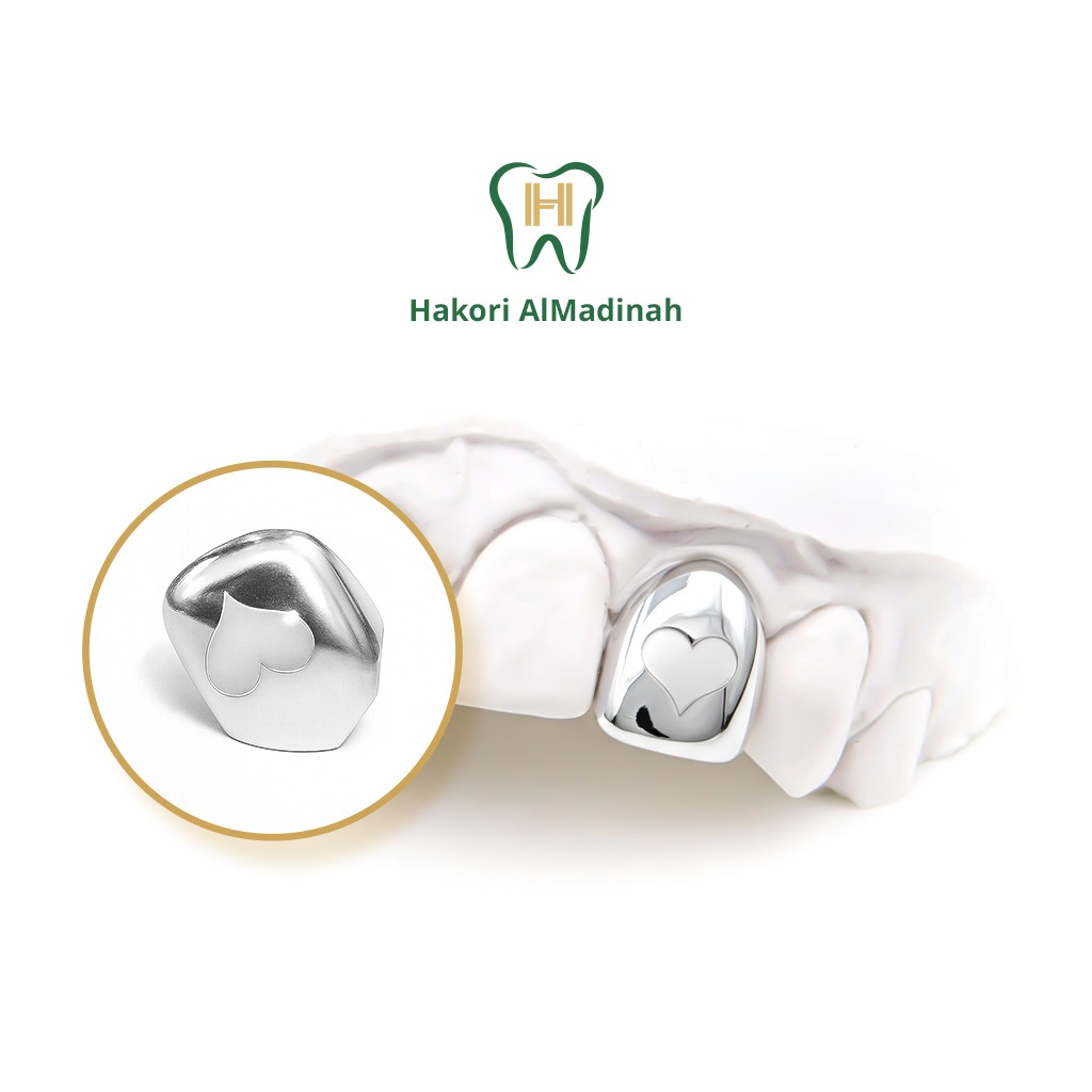 The diamond tooth is made of a special metal (hand made) that gives double shine. The shine never changes, with a big stone in the middle, with a ten-year guarantee.