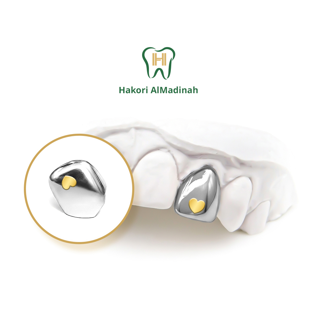 Diamond tooth made of a special metal that gives double shine and the shine never changes. It has a 14-karat gold heart in the middle, and it has a ten-year guarantee.